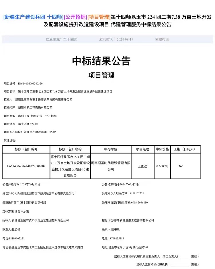 热烈祝贺我司在参与“第十四师昆玉市 224 团二期7.38 万亩土地开发及配套设施提升改造建设项目-代建管理服务”项目时荣获中标!