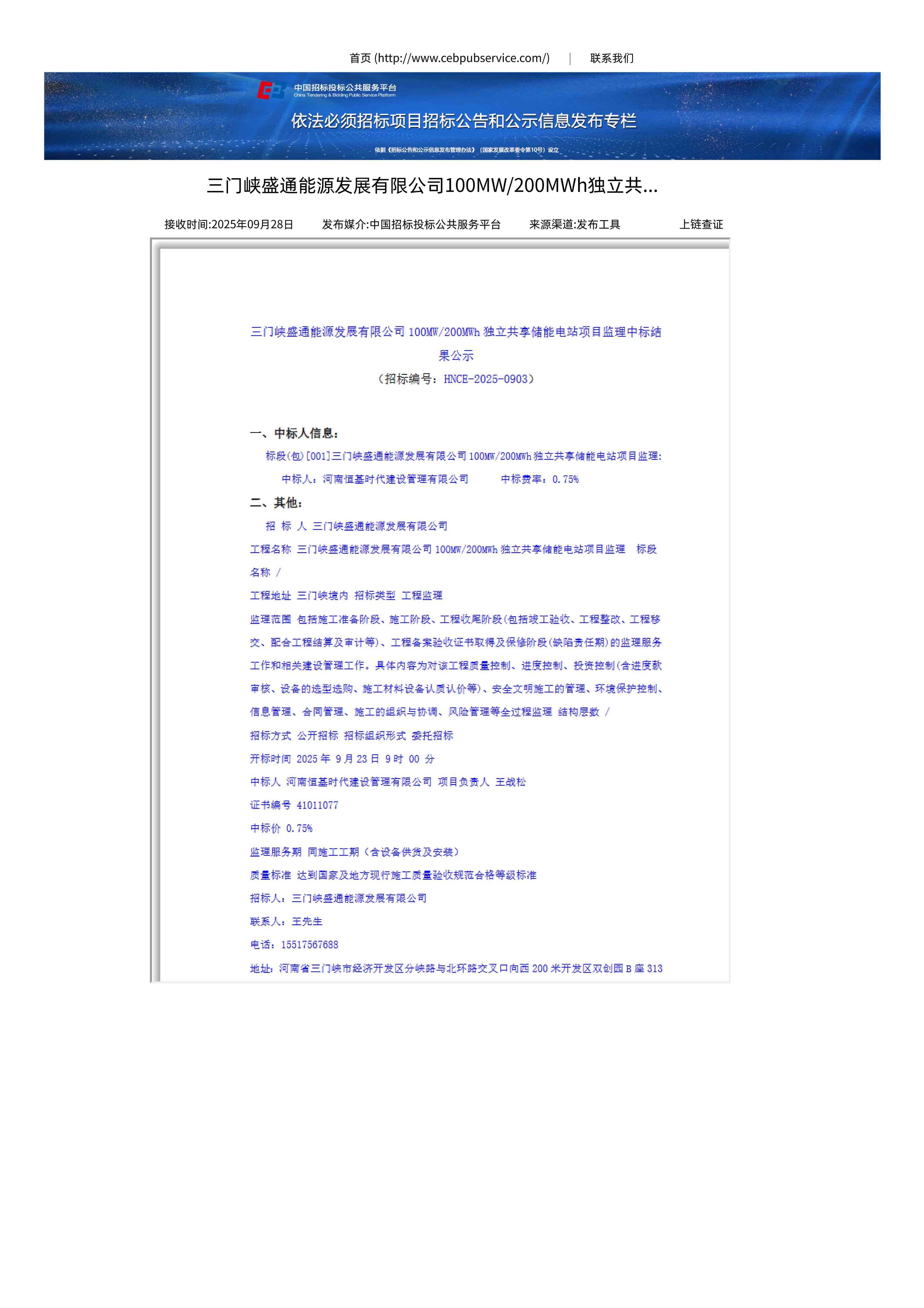 三门峡盛通能源发展有限公司100MW/200MWh独立共享储能电站项目监理-中标结果公示