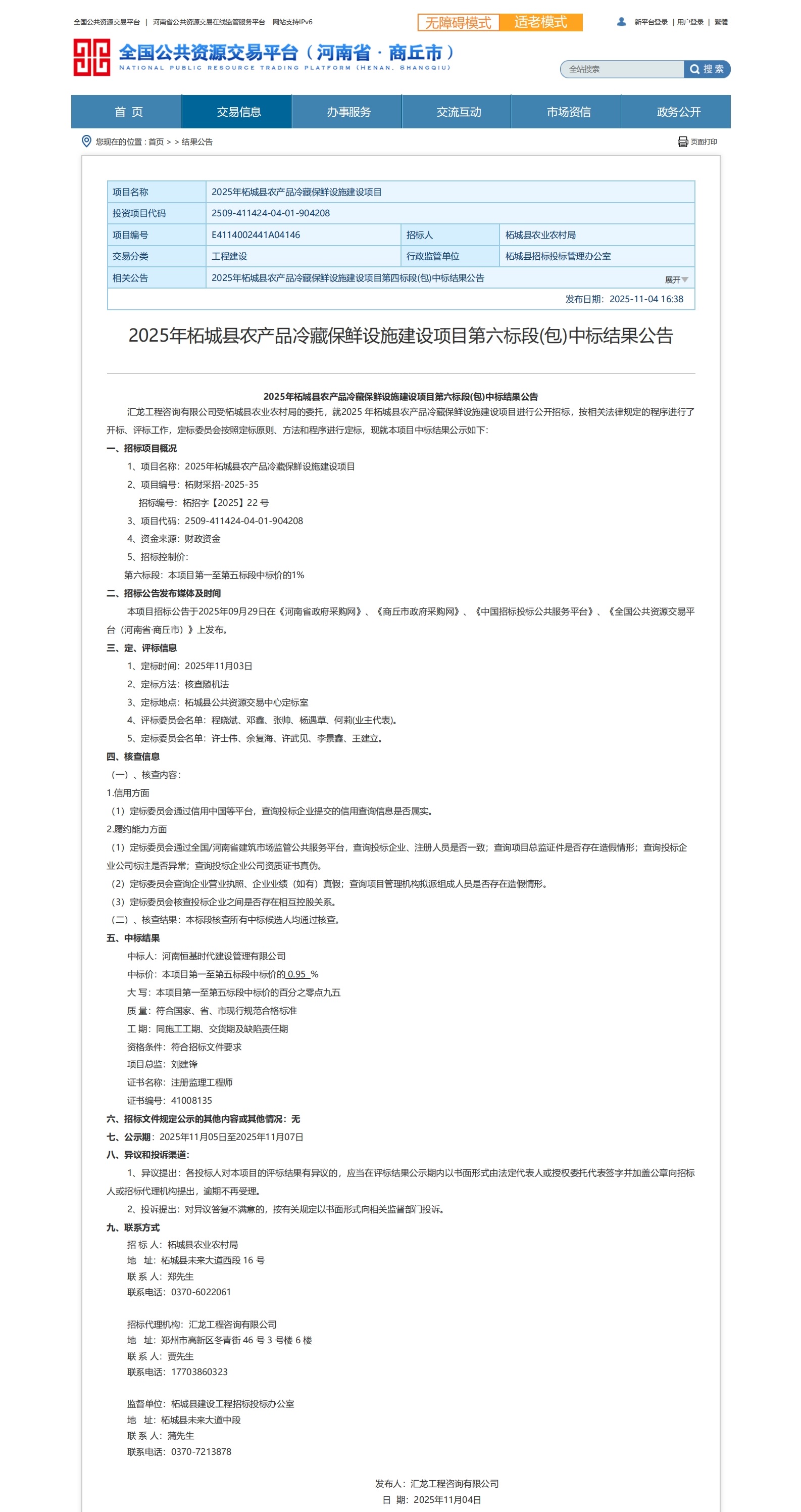 2025年柘城县农产品冷藏保鲜设施建设项目第六标段(包)-中标公告