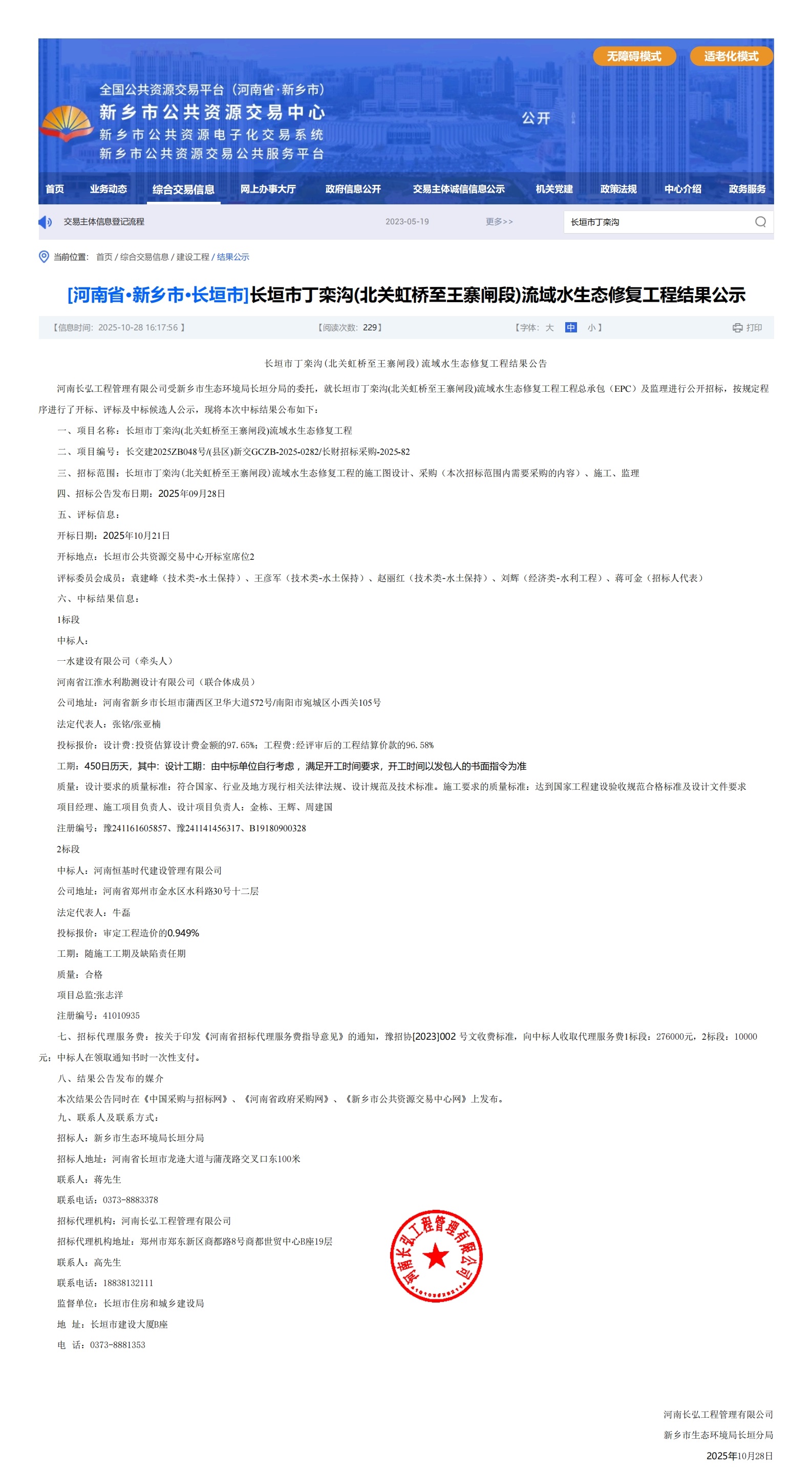长垣市丁栾沟(北关虹桥至王寨闸段)流域水生态修复工程-中标结果公示
