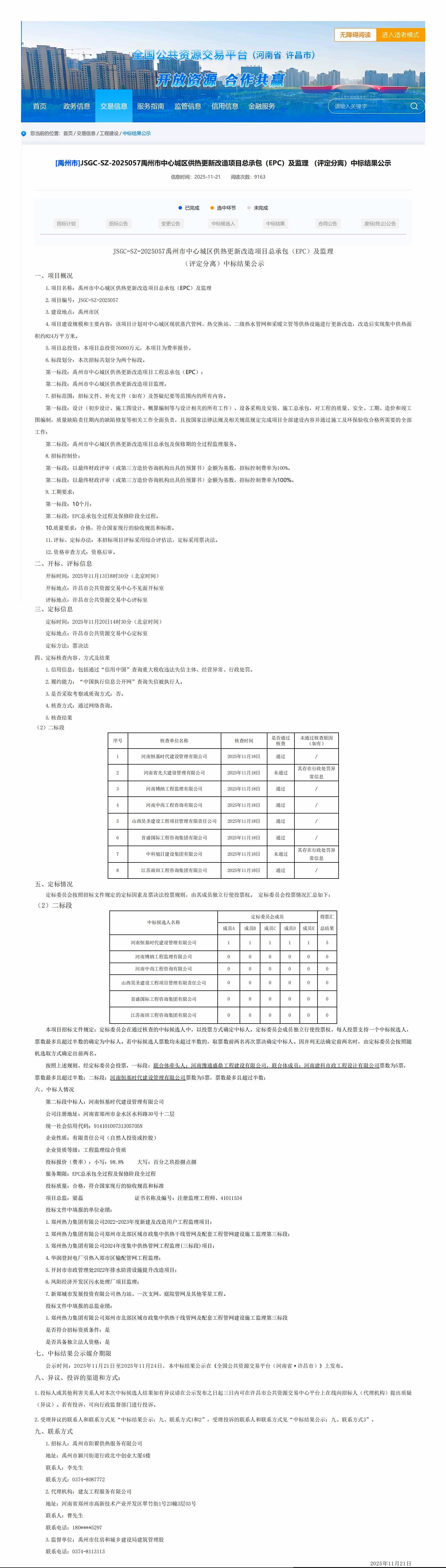 禹州市中心城区供热更新改造项目总承包(EPC)及监理-中标结果公示