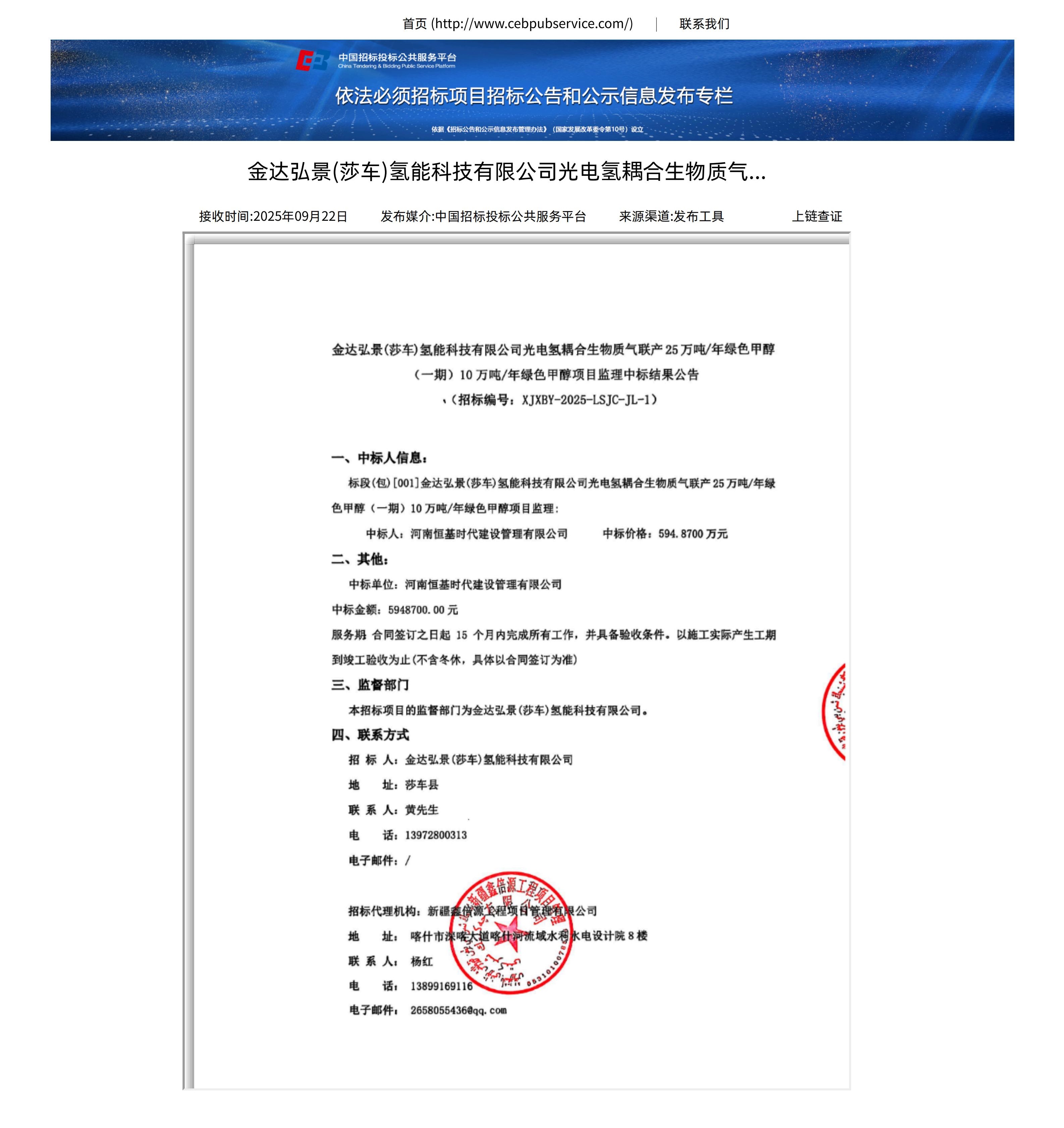 金达弘景(莎车)氢能科技有限公司光电氢耦合生物质气联产25万吨年绿色甲醇(一期)10万吨年绿色甲醇项目监理-中标公示