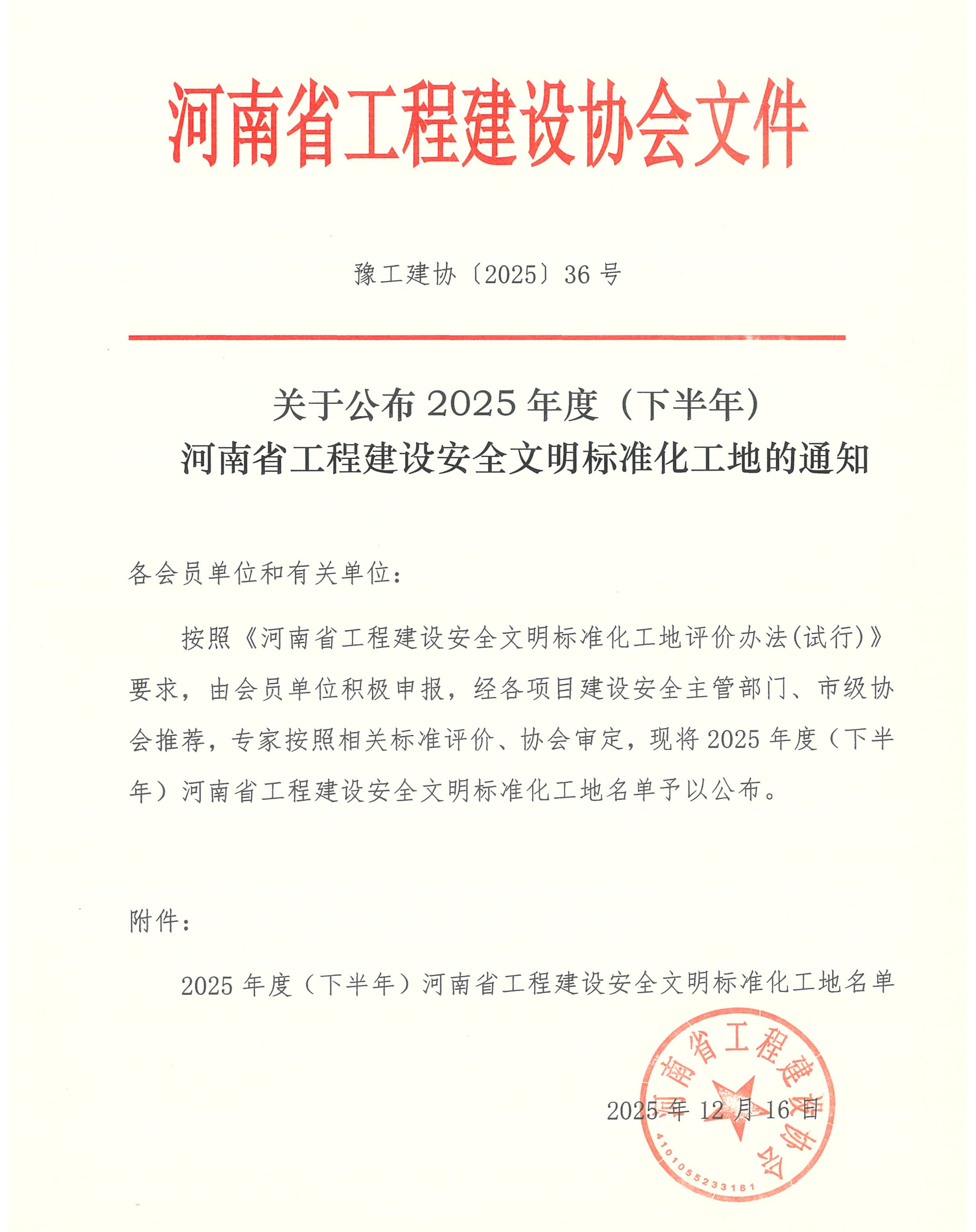 继日前斩获省优质工程奖项后,河南恒基时代建设管理有限公司再添殊荣——由我司监理的 “中国工商银行股份有限公司新乡分行新址装修改造项目”、“郑州市北部区域市政集中供热干线管网及配套工程新龙路能源站安装施工工程”双双入选“2025 年度(下半年)河南省工程建设安全文明标准化工地”名单,两项荣誉的获得,是行业对恒基监理 “品质 + 安全” 双维管控实力的又一次高度认可!