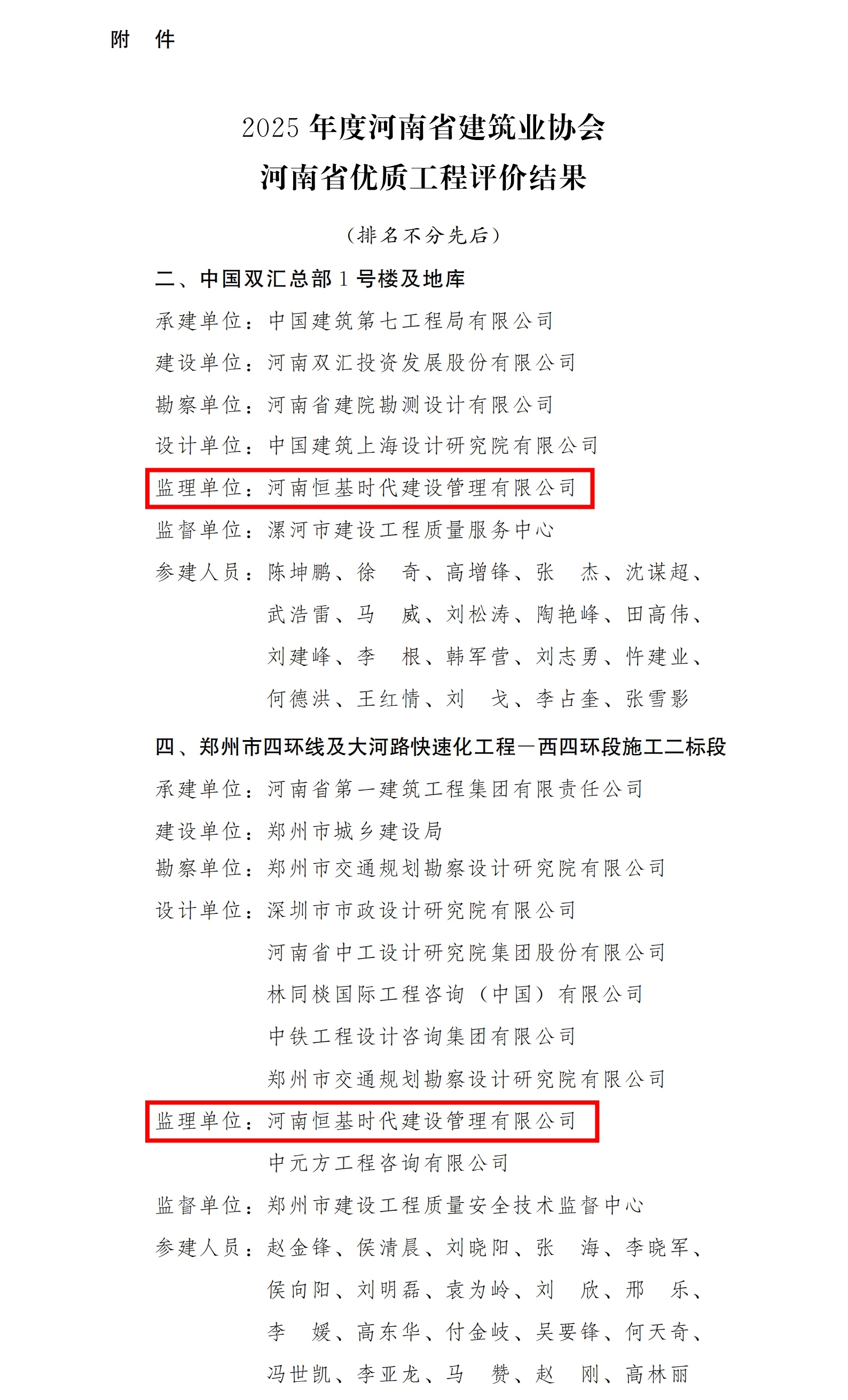 近日,河南省建筑业协会正式公布 “2025 年度河南省优质工程” 评选结果,我司监理的“中国双汇总部项目”、“郑州市四环线及大河路快速化工程-西四环段施工二标段”两大重点工程,凭借过硬品质与精细化管理,双双斩获 “2025 年度河南省优质工程” 荣誉称号!