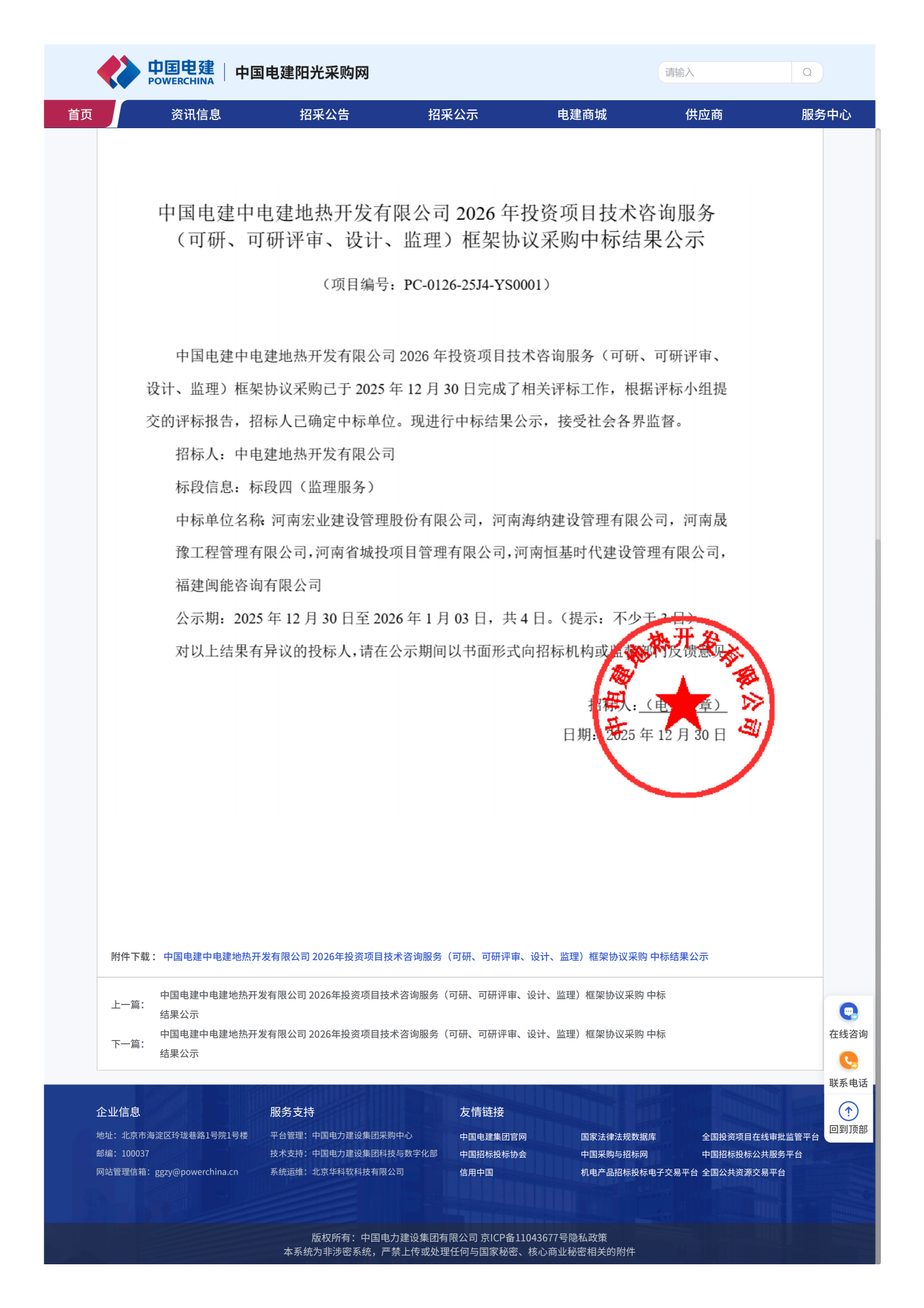中国电建中电建地热开发有限公司 2026 年投资项目技术咨询服务 (可研、可研评审、设计、监理)框架协议采购-中标结果公式