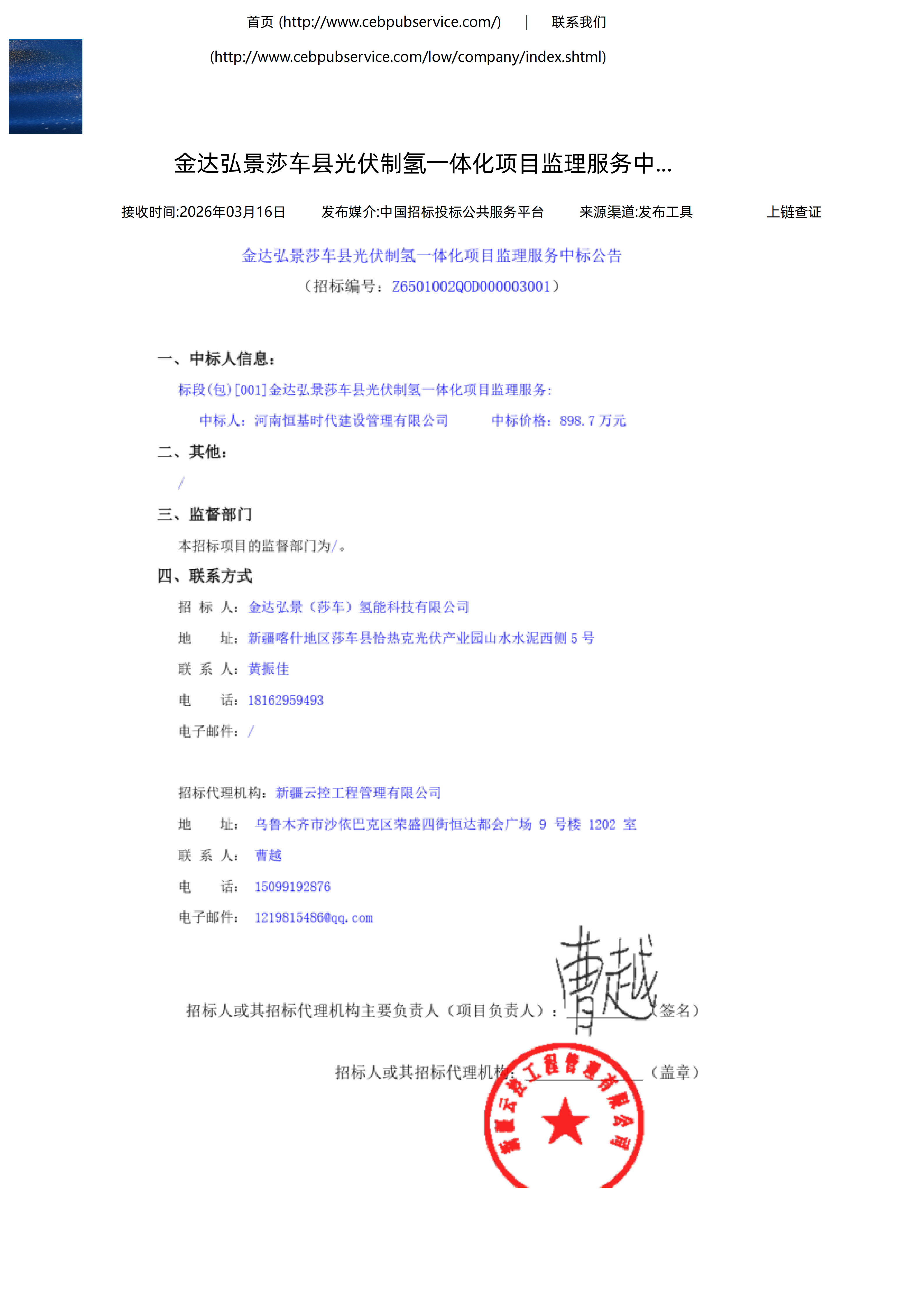 金达弘景莎车县光伏制氢一体化项目监理服务-中标结果公示